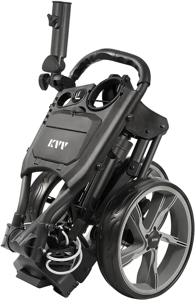 About Golf Push Cart: Designed for optimal performance, the KVV 3 Wheel Golf Push Cart combines ergonomic design with lightweight aluminum construction. Featuring 9.5″ front and two 11.5″ rear maintenance-free EVA cover wheels with ball bearings, this cart ensures a smooth ride and excellent traction on any terrain. With upper and lower brackets equipped with elastic straps, it securely holds golf bags of all sizes, making it a portable and sturdy choice among the Best Golf Push Carts.
